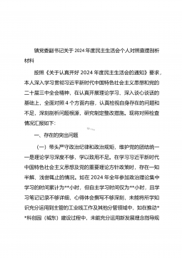 组织委员2024年民主生活会“四个带头”个人对照材料按照2024年度民主生活会的有关要求,本人始终坚持以习近平新时代中国特色社会主义思想为指导,深入学习党的二十大精神,及时跟进学习党的二十届三中全会精神,同时,重点领会把握坚持以人民为中心的发展思想和统筹推进“四个伟大”的系列重大战略决策、部署和意图,自觉地把思想和行动统一到党中央决策部署上来。我聚焦会议主题,结合思想工作实际,深入对照“四个带头”,深入开展谈心谈话,广泛征求意见建议,深入查找自身存在的问题,深刻剖析思想根源,明确了下步整改方向和目标。现具体报告如下:一、存在的主要问题(一)对照带头严守政治纪律和政治规矩,维护党的团结统一方面能...