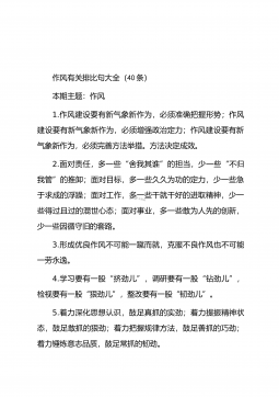 作风建设写作金句65例1.马克思说,如果斗争是在极顺利的成功机会的条件下才着手进行,那么创造世界历史未免就太容易了。2.历史方位决定历史责任。3.双重攻坚的号角,已经在新的历史起点吹响。4.攻坚既需要有坚定的方向,更需要有坚实的基础。5.但是,绝不能以为道路已经铺就,条件已经具备,就不会经历艰难曲折,就不用付出艰苦努力。6.如果说,此前我们面对的是九曲回环的“长河”,那么,未来要跨越的将是波澜壮阔的“大海”。7.前进的道路既有坦途和顺境,更有荆棘和险滩。8.攻坚越往前推进,遇到的矛盾会越突出,碰到的困难会越艰巨。9.逆水行舟、不进则退,除了披荆斩棘、迎难而上,我们别无选择。10.攻坚既需要勇往...
