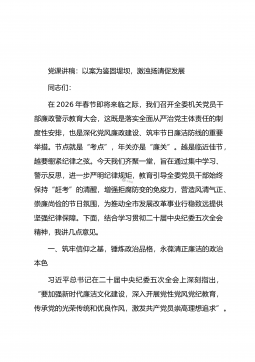 党组织纪检委员在2026年春节节前廉政教育会上的讲话同志们:刚才,我们共同学习了上级关于2026年元旦春节期间正风肃纪的工作通知,观看了警示教育片,分享了廉洁家书诵读心得。岁末年初,春节将至,这既是万家团圆、共庆佳节的美好时刻,也是人情往来密集、“四风”问题易发多发的敏感节点。节日关口,无疑是检验我们党员干部党性修养、纪律作风的“试金石”。作为党支部纪检委员,我深感责任重大。今天的会议,既是一次例行的节前提醒,更是一次严肃的纪律教育和思想淬炼。借此机会,我围绕“守廉关、过廉节、树廉风”,讲四点意见,与大家共勉。一、筑牢思想“防火墙”,让廉洁意识内化于心、外化于行“廉不廉,看过年;洁不洁,看过节...