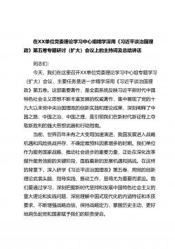 在XX单位党委理论学习中心组精学深用《习近平谈治国理政》第五卷专题研讨(扩大)会议上的主持词及总结讲话