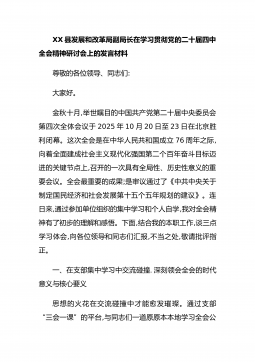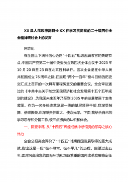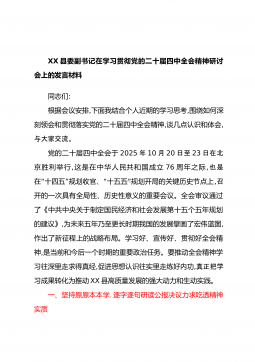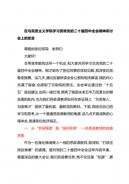 在马克思主义学院学习贯彻党的二十届四中全会精神研讨会上的发言尊敬的各位领导、老师们:大家好!非常荣幸能有这样一个机会,和大家共同学习交流党的二十届四中全会精神。刚才聆听了各位同事的深刻见解,我深受启发、备受鼓舞。这几天,通过反复研读全会公报和相关解读,我的内心充满了振奋,也感到了沉甸甸的责任。全会审议通过的“十五五”规划建议,如同一座灯塔,照亮了我国未来五年乃至更长时期发展的航向,也为我们思政课教师如何在新征程上“为党育人、为国育才”提供了最权威、最鲜活的教材。下面,我结合自己的学习和思考,从一个普通思政课教师的角度,谈几点不甚成熟的心得体会,恳请各位批评指正。一、从“学深悟透”到“信仰弥坚”...