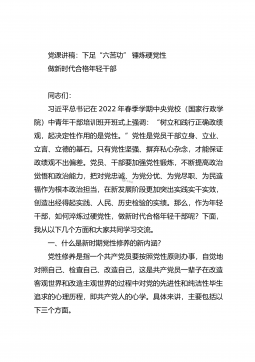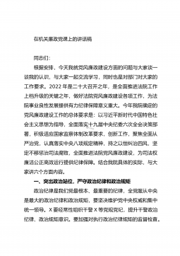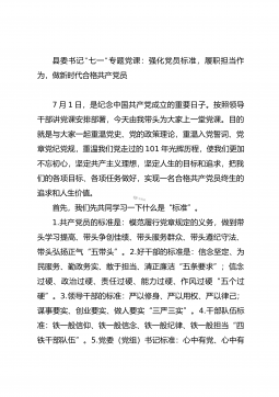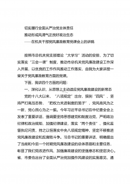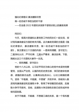 强化纪律意识廉洁履职尽责做一名忠诚干净担当的好干部——在全县2022年度机关党务干部培训班上的廉政党课同志们:今天,很高兴受邀和从事党务工作的同志们一起交流、探讨党风廉政建设方面的有关问题。这次廉政党课的主题是《强化纪律意识,廉洁履职尽责,做一名忠诚干净担当的好干部》。我主要谈三个方面的内容:一是保持清醒,坚守定力;二是深化认识,严守纪律;三是从严要求,廉洁自律。下面,我就从这三个方面和大家作一交流。一、保持清醒,坚守定力党的十八大以来,以习近平同志为核心的党中央坚持党要管党、全面从严治党,以强烈的历史责任感、深沉的使命忧患感、顽强的意志品质,以重典治乱的决心,以壮士断腕的勇气,坚持“不敢腐、...