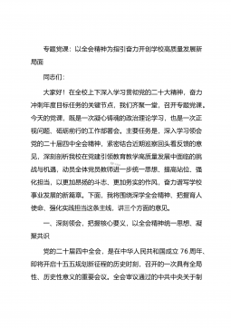 专题党课:围绕中心工作加强基层党建同志们:今天,我们在这里召开一次专题党课,主要目的是深入学习贯彻党的二十大和二十届二中、三中、四中全会精神,结合我们中心当前面临的改革发展任务,共同探讨如何以高质量党建引领和“保障中心事业的高质量发展。今天我讲的主题是围绕中心工作”加强基层党建。党的二十大报告深刻指出,全面建设社会主义现代化国家、全面推进中华民族伟大复兴,关键在党。而我们党的力量,源自于每一个坚强有力的基层组织,来自于每一位在岗位上默默奉献的“”共产党员。基层党组织是党的肌体的神经末梢,是党联系服务“”群众的最后一公里,其地位之重要、作用之关键,怎么强调都不过分。对于我们中心而言,基层党建工作...