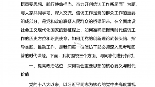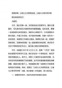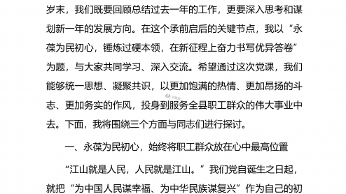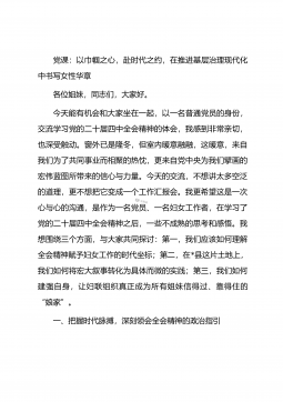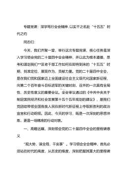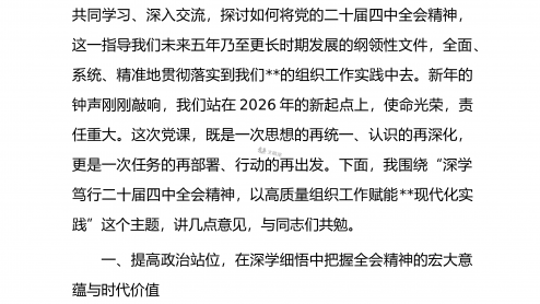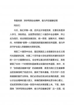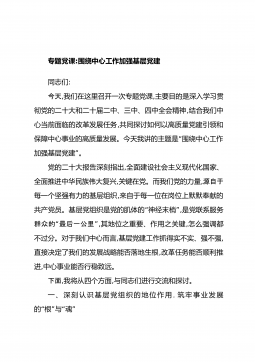 专题党课:围绕中心工作加强基层党建同志们:今天,我们在这里召开一次专题党课,主要目的是深入学习贯彻党的二十大和二十届二中、三中、四中全会精神,结合我们中心当前面临的改革发展任务,共同探讨如何以高质量党建引领和“保障中心事业的高质量发展。今天我讲的主题是围绕中心工作”加强基层党建。党的二十大报告深刻指出,全面建设社会主义现代化国家、全面推进中华民族伟大复兴,关键在党。而我们党的力量,源自于每一个坚强有力的基层组织,来自于每一位在岗位上默默奉献的“”共产党员。基层党组织是党的肌体的神经末梢,是党联系服务“”群众的最后一公里,其地位之重要、作用之关键,怎么强调都不过分。对于我们中心而言,基层党建工作...