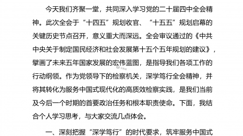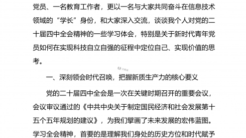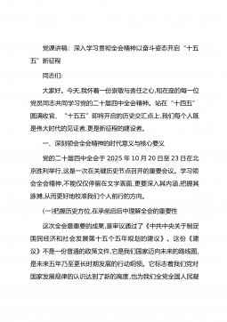 党课讲稿:深入学习贯彻全会精神以奋斗姿态开启“十五五”新征程同志们:大家好。今天,我怀着一份崇敬与责任之心,和在座的每一位党员同志共同学习党的二十届四中全会精神。站在“十四五”圆满收官、“十五五”即将开启的历史交汇点上,我们每个人既是伟大时代的见证者,更是新征程的建设者。一、深刻领会全会精神的时代意义与核心要义党的二十届四中全会于2025年10月20日至23日在北京胜利举行,这是一次在关键历史节点召开的重要会议。学习领会全会精神,不能仅仅停留在文字表面,更要深入其内涵,把握其脉搏,从而更好地校准我们个人前行的方向。(一)把握历史方位,在承前启后中理解全会的重要性这次全会最重要的成果,是审议通过...