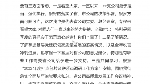党课讲稿:强化党建引领、主动有效作为,切实为高质量发展提供坚强政治保障同志们:大家好,司庆前夕,来我的党建联系点**支公司调研,主要有三方面考虑。一是看望大家。一直以来,**支公司勇于担当、强化执行,很好的落实了省、市公司的决策部署,很多方面可圈可点,这次我也是代表省公司党委、总经理室,专程来看望大家,对同志们一直以来的努力拼搏、辛勤付出,特别是四季度的真抓实干表示衷心感谢!你们辛苦了!二是了解情况。了解掌握基层党建统领高质量发展的落实情况、以及全年收官冲刺进展,也掌握一下基层对省公司的意见建议,特别是有哪些工作需要省公司给予进一步支持。三是共同学习。根据“2022年度挂点包片及联系点调研工作...
