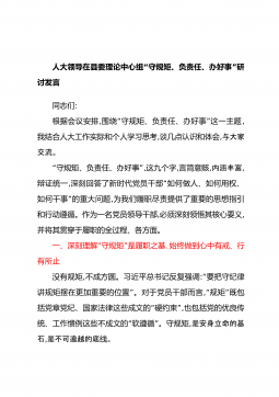 “”人大领导在县委理论中心组守规矩、负责任、办好事研讨发言同志们:根据会议安排,“”围绕守规矩、负责任、办好事这一主题,我结合人大工作实际和个人学习思考,谈几点认识和体会,与大家交流。“”守规矩、负责任、办好事,这九个字,言简意赅,内涵丰富,辩证统一,“深刻回答了新时代党员干部如何做人、如何用权、”如何干事的重大问题,为我们履职尽责提供了重要的思想指引和行动遵循。作为一名党员领导干部,必须深刻领悟其核心要义,并将其贯穿于履职的全过程、各方面。“”一、深刻理解守规矩是履职之基,始终做到心中有戒、行有所止文秘家园网站(wenmijiayuan.com)整理发布没有规矩,不成方圆。习近平总书记反复强...