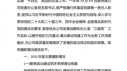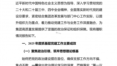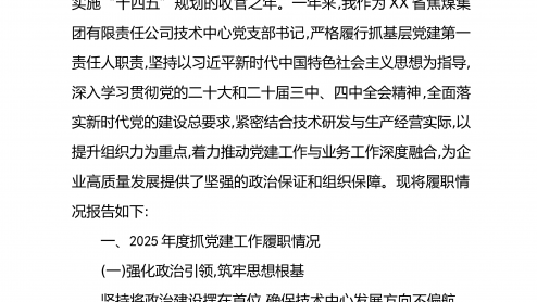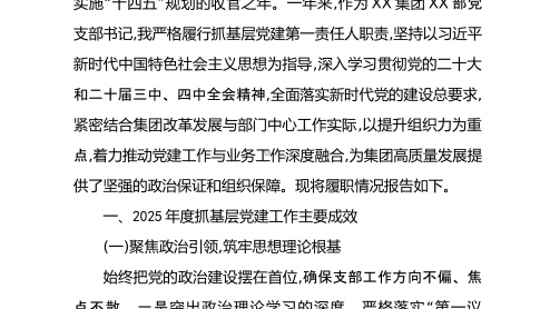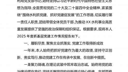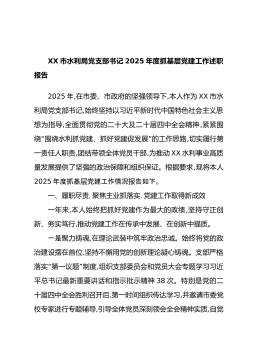 XX市水利局党支部书记2025年度抓基层党建工作述职报告2025年,在市委、市政府的坚强领导下,本人作为XX市水利局党支部书记,始终坚持以习近平新时代中国特色社会主义思想为指导,全面贯彻党的二十大及二十届四中全会精神,紧紧围“”绕围绕水利抓党建、抓好党建促发展的工作思路,切实履行第一责任人职责,团结带领全体党员干部,为推动XX水利事业高质量发展提供了坚强的政治保障和组织保证。根据要求,现将本人2025年度抓基党建工作情况告如下。层报一、履职尽责,聚焦主业抓落实,党建工作取得新成效一年来,本人始终把抓好党建作为最大的政绩,坚持守正创新、务实笃行,推动党建工作在传承中发展、在创新中提质。一是聚力铸...