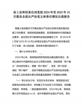 县工业和信息化局党组2024年至2025年10月落实全面从严治党主体责任情况自查报告根据上级党委关于开展全面从严治党主体责任落实情况自查工作的要求,我局党组高度重视,紧紧围绕新时代党的建设总要求,结合党纪学习教育和巡视巡察整改工作,对2024年1月至2025年10月以来落实全面从严治党主体责任情况进行了全面、深入的自查。现将有关情况报告如下:一、履行主体责任情况2024年以来,局党组始终把党的政治建设摆在首位,坚持以新时代中国特色社会主义思想为指导,深刻领悟“两个确立”的决定性意义,增强“四个意识”、坚定“四个自信”、做到“两个维护”,坚定不移推动全面从严治党向纵深发展,为全县工业和信息化事业...