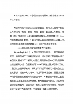 X县科技局2020年争创全国文明城市工作总结暨2021年工作思路为培育和践行社会主义核心价值观,坚持以人民为中心的工作导向和“利民、惠民、为民、靠民”的创建工作原则,根据《关于报送2020年争创全国文明城市工作总结暨2021年工作思路的通知》要求,X县科技局认真梳理总结全年创城工作,现将2020年创城工作总结暨2021年工作思路报告如下。一、2020年争创全国文明城市工作开展情况##paidbegin##(一)深化理想信念建设。一是加强组织管理,确保创城工作得到切实推进,成立以局长邓晓明为组长的创建文明城市工作领导小组及全民健康生活方式行动健康单位建设领导小组,负责科技局2020年争创全国文明...