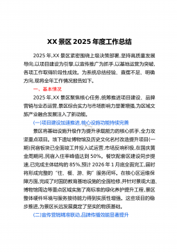 XX景区2025年度工作总结2025年,XX景区紧密围绕上级决策部署,坚持高质量发展导向,以项目建设为引擎,以宣传推广为抓手,以基地运营为突破,各项工作取得阶段性成效。为系统总结经验、查摆不足、明确方向,现将全年工作情况报告如下。一、基本情况2025年,XX景区聚焦核心任务,统筹推进项目建设、品牌营销与业态运营,景区综合实力与市场影响力显著增强,为区域文旅产业融合发展注入了新动能。(一)项目建设加速推进,核心设施功能持续完善景区将基础设施升级作为提升承载能力的核心抓手,全力攻坚重点项目。垓下遗址博物馆及历史文化名村改造提升项目(一期)民宿板块已全面竣工并投入试运营,市场反响积极,在国庆黄金周期...