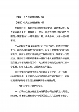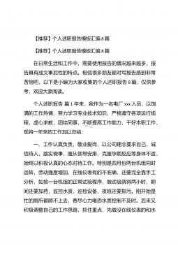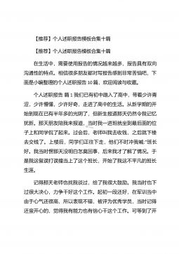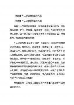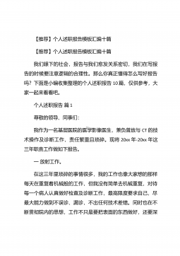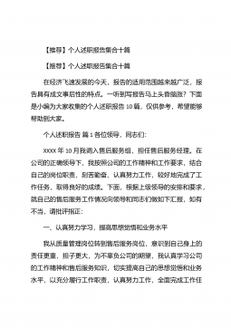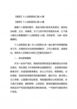 【推荐】个人述职报告汇编10篇【推荐】个人述职报告汇编10篇随着个人素质的提升,报告与我们愈发关系密切,报告包含标题、正文、结尾等。为了让您不再为写报告头疼,以下是小编为大家整理的个人述职报告10篇,仅供参考,大家一起来看看吧。个人述职报告篇1本人任现职以来一直从事中学物理的教学工作。长期担任毕业班的物理教学,工作认真负责,成绩突出。现将本人任现职以来的工作情况总结如下:一、政治思想素质作为一名共产党员,我始终坚持把坚定正确的政治方向放在首位,带头落实《中学教师职业道德规范》,全面贯彻党的教育方针,忠诚党的教育事业,安心三尺讲台,默默耕耘,无私奉献,有良好的师德风范和教师素养,遵纪守法,教书育...