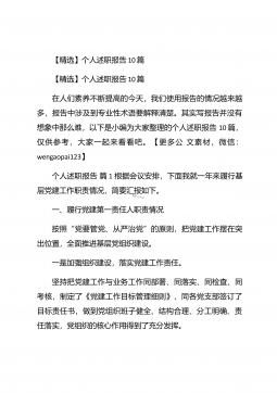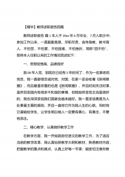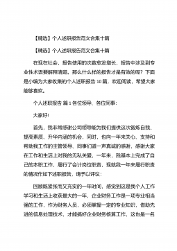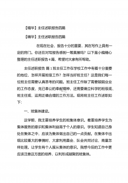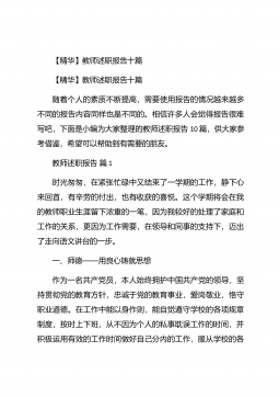 【精华】教师述职报告十篇【精华】教师述职报告十篇随着个人的素质不断提高,需要使用报告的情况越来越多不同的报告内容同样也是不同的。相信许多人会觉得报告很难写吧,下面是小编为大家整理的教师述职报告10篇,供大家参考借鉴,希望可以帮助到有需要的朋友。教师述职报告篇1时光匆匆,在紧张忙碌中又结束了一学期的工作,静下心来回首,有辛劳的付出,也有收获的喜悦。这个学期将会在我的教师职业生涯留下浓重的一笔,因为我较好的处理了家庭和工作的关系,更因为工作需要,在领导和同事的支持下,迈出了走向语文讲台的一步。一、师德——用良心铸就思想作为一名共产党员,本人始终拥护中国共产党的领导,坚持贯彻党的教育方针,忠诚于党的...