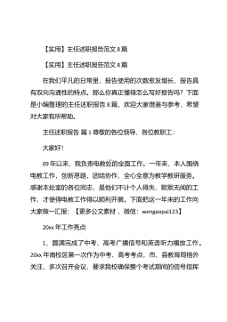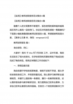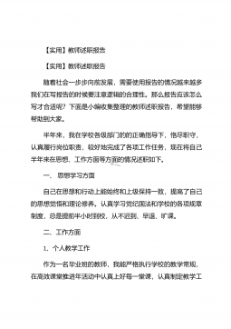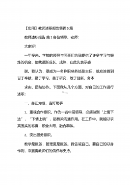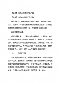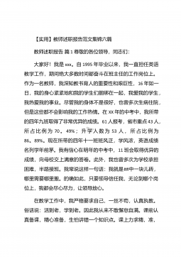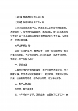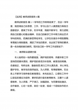 【实用】教师述职报告3篇教师述职报告篇1一学年的工作即将结束了,在这一学年里,我觉得自己在思想、工作、学习以及个人素质能力等各方面都进步、提高了许多。在本年度,我能不断学习,努力进取,用自己的爱心和敬业精神,在自己的教学工作中努力突出艺术学科的特色,把美的享受带给学生,让学生在音乐中得到熏陶,审美能力得到提高,满足了学生的需求,也达到了领导的要求,是一名合格的音乐教师。现对自己的一学年工作述职如下:一、教师职业道德方面本人始终如一地热爱祖国,拥护党的领导,热爱本职工作坚持四项基本原则,拥护党的各项方针政策,教育目的明确,态度端正,专研业务,勤奋刻苦;努力工作认真负责,关心学生,爱护学生,做学生...