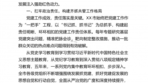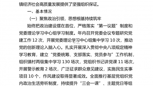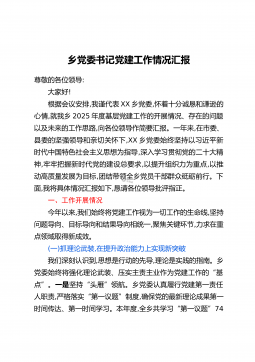 乡党委书记党建工作情况汇报尊敬的各位领导:大家好!根据会议安排,我谨代表XX乡党委,怀着十分诚恳和谦逊的心情,就我乡2025年度基层党建工作的开展情况、存在的问题以及未来的工作思路,向各位领导作简要汇报。一年来,在市委、县委的坚强领导和亲切关怀下,XX乡党委始终坚持以习近平新时代中国特色社会主义思想为指导,深入学习贯彻党的二十大精神,牢牢把握新时代党的建设总要求,以提升组织力为重点,以推动高质量发展为目标,团结带领全乡党员干部群众砥砺前行。下面,我将具体情况汇报如下,恳请各位领导批评指正。一、工作开展情况今年以来,我们始终将党建工作视为一切工作的生命线,坚持问题导向、目标导向和结果导向相统一,...