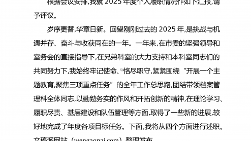 在XX市委办公厅2025年度总结大会上的个人述职报告尊敬的各位领导,同志们:大家好!根据会议安排,我就2025年度个人履职情况作如下汇报,请予评议。岁序更替,华章日新。回望刚刚过去的2025年,是挑战与机遇并存、奋斗与收获同在的一年。一年来,在市委的坚强领导和室务会的直接指导下,在兄弟科室的大力支持和本科室同志们的共同努力下,我始终牢记使命、恪尽职守,紧紧围绕“开展一个主题教育,聚焦三项重点任务”的全年工作总思路,团结带领档案管理科全体同志,以勤勉务实的作风和开拓创新的精神,在理论学习、履职尽责、基层建设和队伍管理等方面,取得了一些新的进展,较好地完成了年度各项目标任务。下面,我将从四个方面进...