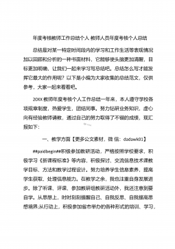 年度考核教师工作总结个人教师人员年度考核个人总结总结是对某一特定时间段内的学习和工作生活等表现情况加以回顾和分析的一种书面材料,它能够使头脑更加清醒,目标更加明确,让我们一起来学习写总结吧。总结怎么写才能发挥它最大的作用呢?以下是小编为大家收集的总结范文,仅供参考,大家一起来看看吧。20XX教师年度考核个人工作总结一年来,本人遵守学校各项规章制度,热爱学生,团结同事。努力钻研业务知识,虚心向有经验教师请教,通过自己的努力取得了不错的成绩,现汇报如下: 一、教学方面【更多公文素材,微信:dadawk01】##paidbegin##积极参加教研活动,严格按照学校要求,积极学习《新课程标准》等内容...