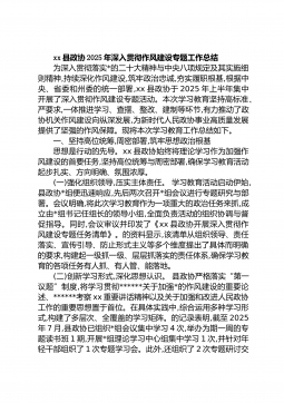 xx县政协2025年深入贯彻作风建设专题工作总结为深入贯彻落实*的二十大精神与中央八项规定及其实施细则精神,持续深化作风建设,筑牢政治忠诚,夯实履职根基,根据中央、省委和州委的统一部署,xx县政协于2025年上半年集中开展了深入贯彻作风建设专题活动。本次学习教育坚持高标准、严要求,一体推进学习、查摆、整改、建制等环节,有力推动了政协机关作风建设向纵深发展,为新时代人民政协事业高质量发展提供了坚强的作风保障。现将本次学习教育工作总结如下。一、坚持高位统筹,周密部署,筑牢思想政治根基思想是行动的先导。xx县政协始终将理论学习作为加强作风建设的首要任务,坚持高位统筹与周密部署,确保学习教育活动起步扎...