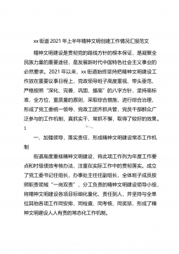 xx街道2021年上半年精神文明创建工作情况汇报范文精神文明建设是贯彻党的路线方针的根本保证,是凝聚全民族力量的重要途径,是发展新时代中国特色社会主义事业的必然要求。2021年以来,xx街道始终坚持把精神文明建设工作放在重要议事日程上,党政领导班子高度重视、带头垂范,严格按照“深化、完善、巩固、提高”的八字方针,坚持高标准,全方位,重质量的原则,采取综合措施,进行综合治理,形成了党工委统一领导,党政工团齐抓共管,党员干部群众广泛参与的工作机制,真抓实干,常抓不懈,取得了较好的效果。1一、加强领导,落实责任,形成精神文明建设常态工作机制街道高度重视精神文明建设,将此项工作列为年度工作要点和村级绩...