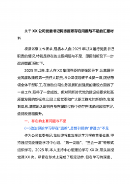 关于XX公司党委书记同志履职存在问题与不足的汇报材料根据巡察工作要求,现将本人自2025年以来履行党委书记职责的情况,特别是存在的主要问题与不足、原因剖析及下一步改进措施,汇报如下。2025年以来,本人在XX集团党委的坚强领导下,认真履行党风廉政建设第一责任人职责,与公司班子成一道领导员,团结带领全体干部职工,在推动公司业务发展和加强党的建设方面做了一些工作,取得了一定成效。但对照新时代党的建设总要求和高质量发展的新标准,以及上级党委和广大职工群众的新期待,我深刻反思,清醒地认识到自身在履职过程中仍存在诸多问题和不足,亟待改进和提升。一、存在的主要与不足问题(一)“”政治理论学习存在温差,“”...