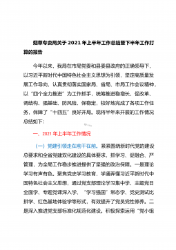 烟草专卖局关于2021年上半年工作总结暨下半年工作打算的报告今年以来,我局在市局党委和县委县政府的正确领导下,以习近平新时代中国特色社会主义思想为引领,坚定高质量发展工作导向,认真贯彻落实国家局、省局、市局工作会议精神,以“四个全力推进”为工作抓手,统筹推进稳增长、促改革、调结构、强基础、防风险、保稳定,较好地完成了各项工作任务,保障了“十四五”良好开局。现将半年来开展的工作情况总结如下:一、2021年上半年工作情况(一)党建引领走在前干在前。紧紧围绕新时代党的建设总要求和全省党建双化建设的具体要求,抓学习、促融合、严管理,为全局工作稳步推进提供了坚强的政治保障。一是理论学习有声有色。聚焦党史...
