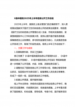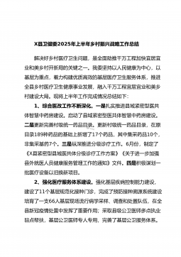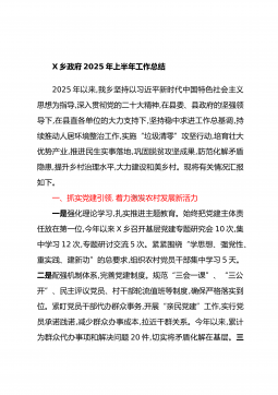 X乡政府2025年上半年工作总结2025年以来,我乡坚持以习近平新时代中国特色社会主义思想为指导,深入贯彻党的二十大精神,在县委、县政府的坚强领导下,在县直各单位的大力支持下,坚持稳中求进工作总基调,持续推动人居环境整治工作,实施“垃圾清零”攻坚行动,培育壮大优势产业,推进民生实事落地,巩固脱贫攻坚成果,防范化解矛盾隐患,提升乡村治理水平,大力建设和美乡村。现将有关情况汇报如下。一、抓实党建引领,着力激发农村发展新活力一是强化理论学习,扎实推进主题教育。始终把党建主体责任放在第一位,今年以来X乡召开基层党建专题研究会10次,集中学习12次,专题研讨交流5次。紧紧围绕“学思想、强党性、重实践、建...