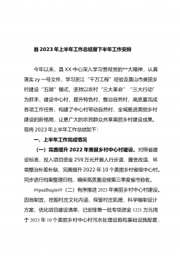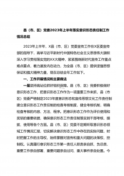 县(市、区)党委2023年上半年落实意识形态责任制工作情况总结2023年上半年,X县(市、区)党委宣传工作在X区委宣传部的指导下,高举习近平新时代中国特色社会主义思想伟大旗帜深入学习贯彻落实党的XX大精神,紧紧围绕新时代宣传工作重点难点要点,着力激发内在动力,为全县(市、区)提供坚强思想保证和强大精神力量,现在总结全年工作如下。一、工作开展情况和主要做法一是坚持高站位抓好组织保障。县(市、区)党委积极做好意识形态工作,把意识形态工作作为一项重要工作来抓,县(市区)党委严格制定2023年度意识形态和宣传思想文化工作责任制建立意识形态工作责任制的检查考核制度,健全考核机制,明确检查考核的内容、方法...