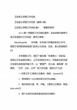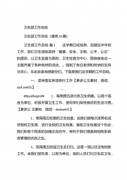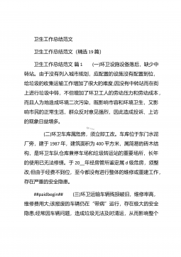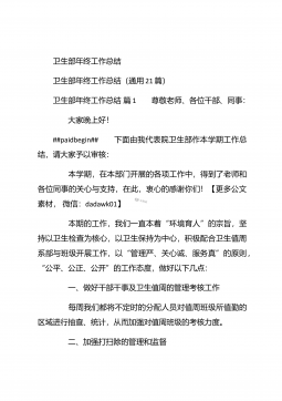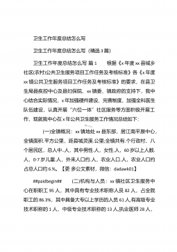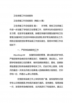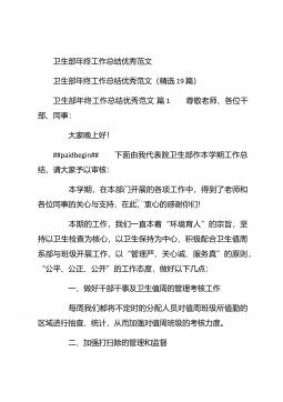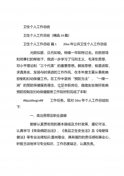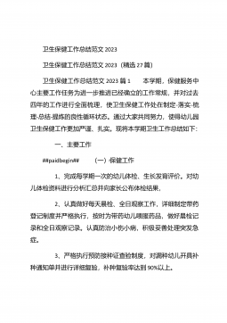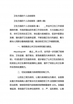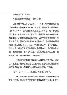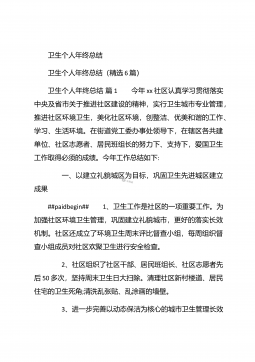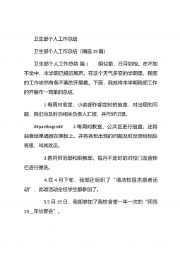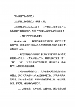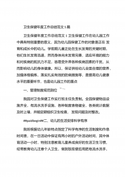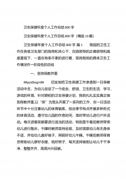 卫生保健年度个人工作总结800字卫生保健年度个人工作总结800字(精选19篇)卫生保健年度个人工作总结800字篇1 我园的卫生工作在各级卫生部门的指导和关心下,在园领导的正确领导和高度重视下,一直在有条不紊的进行着,现将我班的具体卫生工作情况作一阶段性的总结 一、坚持保教并重##paidbegin## 切实地把卫生保健工作渗透到一日保教活动中去,为幼儿创设了一个安全、舒适、卫生的生活、学习、游戏的环境,针对期初的卫生保健计划,我班扎扎实实真正做到保教并重,以“保”为笼头开展了一系列的工作,在一日活动环节中十分注重幼儿的体育锻炼,结合季节特点开展多种形式的体育活动,遵守幼儿园的作息时间,准...