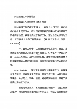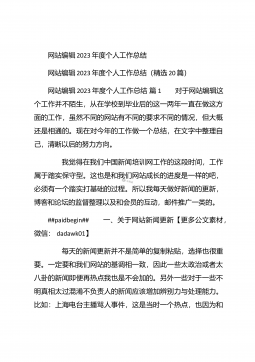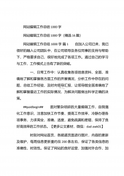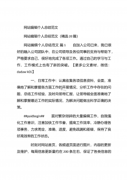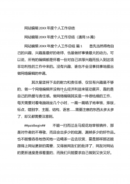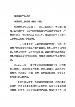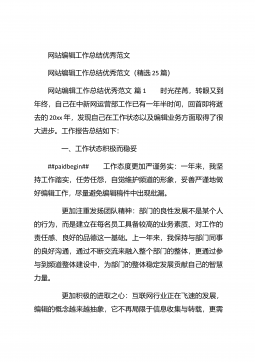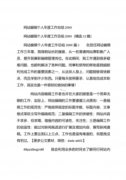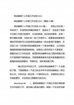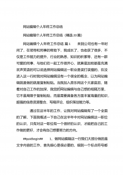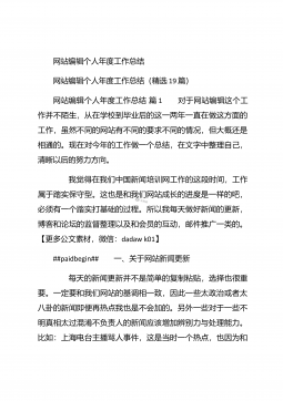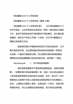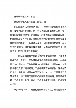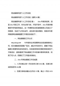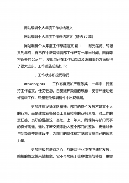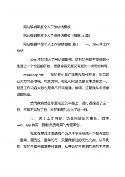 网站编辑年度个人工作总结范文网站编辑年度个人工作总结范文(精选15篇)网站编辑年度个人工作总结范文篇1 不得不说时间过的真快,自己在xx公司xx部工作已有两多月了。这段时间是我人生的一个重大转折点,一个在校生成为一名社会人员的转型期,在这期间我失去了,也收获了,更多的是我成长了。 走出校园我还懵懵懂懂,是电玩巴士提供了这样一个平台让我去学习,去适应,去调整,在这里我表示由衷地感谢!部门里的每个人都是那么的友善,无私的传授经验,工作中耐心的指导,xx部就是一个温暖的大家庭,我喜欢这里。##paidbegin## 回首自己的工作历程,一点一滴学起,每天都忙碌充实着,在这里我学到了SEO推广、...