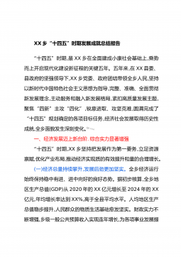 XX乡“十四五”时期发展成就总结报告“十四五”时期,是XX乡在全面建成小康社会基础上,乘势而上开启现代化建设新征程的关键五年。五年来,在XX县委、县政府的坚强领导下,XX乡党委、政府团结带领全乡人民,坚持以新时代中国特色社会主义思想为指导,完整、准确、全面贯彻新发展理念,主动服务和融入新发展格局,紧扣高质量发展主题,聚焦“四新”主攻“四化”,锐意进取、攻坚克难,圆满完成了“十四五”规划确定的各项目标任务,经济社会发展取得历史性成就,全乡面貌发生深刻变化。一、经济发展迈上新台阶,综合实力显著增强“十四五”时期,XX乡坚持把发展作为第一要务,立足资源禀赋,优化产业布局,推动经济实现质的有效提升和量...