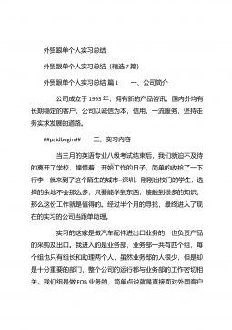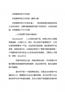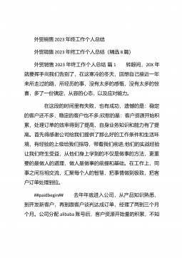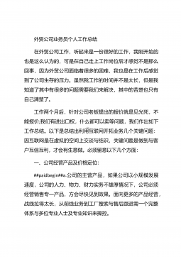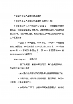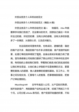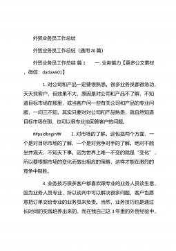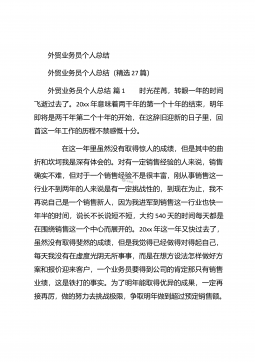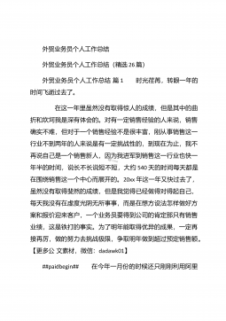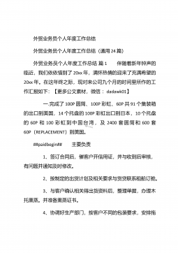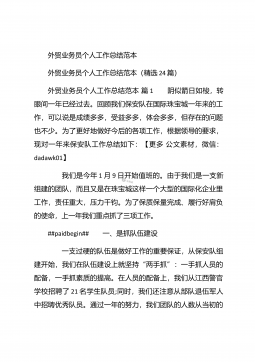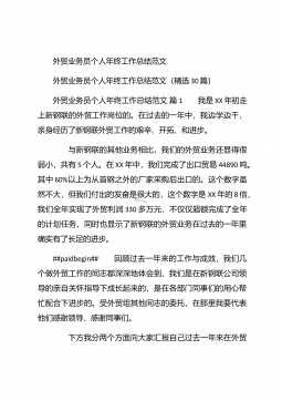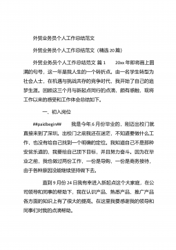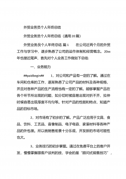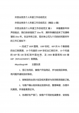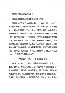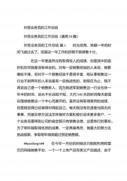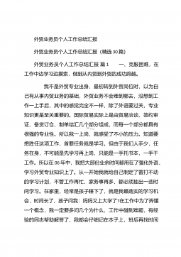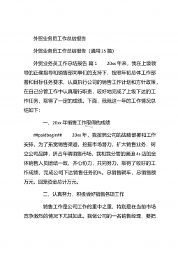 外贸业务员工作总结报告外贸业务员工作总结报告(通用25篇)外贸业务员工作总结报告篇1 20xx年来,我在上级领导的正确指导和销售部同事们的支持下,按照年初总体工作部署和目标任务要求,认真执行公司的销售工作计划和方针政策,在自己分管工作中认真履行职责,较好地完成了上级下达的工作任务,取得了一定的成绩。下面,我就这一年的工作情况总结如下: 一、20xx年销售工作取得的成绩##paidbegin## 20xx年,我按照公司的战略部署和工作安排,为了拓宽销售渠道,挖掘市场潜力,扩大销售业务,树立公司品牌,挤占车辆销售市场,我和我分管的奥迪4s店的全体销售人员团结一致,齐心协力,共同努力,取得了较...