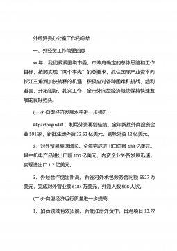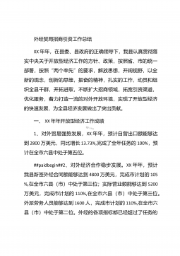 外经贸局招商引资工作总结XX年年,在县委、县政府的正确领导下,我县认真贯彻落实中央关于开放型经济工作的方针、政策,按照省、市的统一部署,按照“两个率先”的要求,解放思想,开阔视野,以全新的观念,创新的思维,振奋的精神,扎实的工作,动员和组织全县干群,开拓进取,不断扩大招商领域,拓宽引资渠道,优化服务,着力打造一流的对外开放环境,实现了开放型经济的快速发展,为全县经济发展做出了突出贡献。一、XX年年开放型经济工作成绩1、对外贸易强势发展,XX年年,预计自营出口额能够达到2800万美元,同比增长13.73%,完成了全年任务的100%,预计在全市六县中处于第五位。##paidbegin##2、对外经...