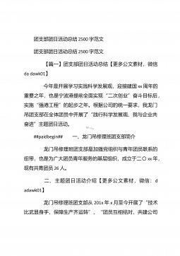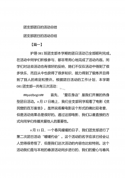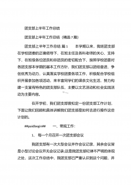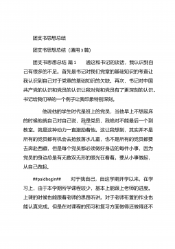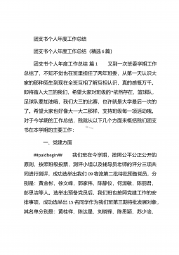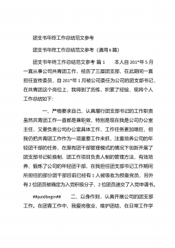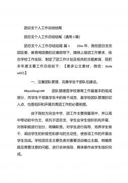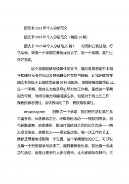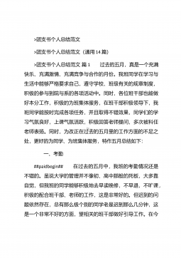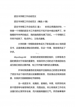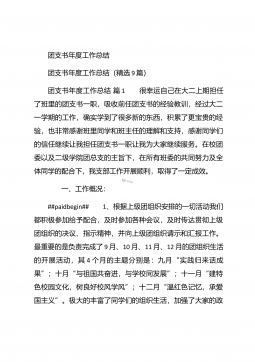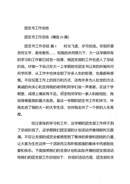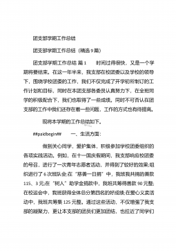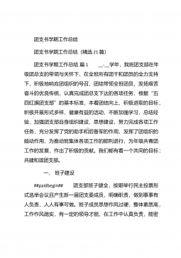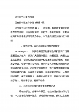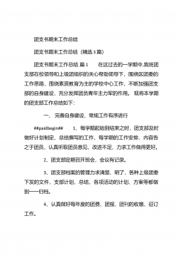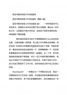 团支书期末工作总结团支书期末工作总结(精选3篇)团支书期末工作总结篇1 在这过去的一学期中,我班团支部在校领导和上级团组织的关心帮助领导下,围绕区团委的工作思路,围绕素质教育为主的学校中心工作,不断加强团支部的自身建设,充分发挥团员青年主力军的作用。现将本学期的团支部工作总结如下: 一、完善自身建设,常规工作有序进行##paidbegin## 1、每学期起始到结束之时,团支部及时做好计划制定、总结撰写的工作,每学期的工作安排、内容告之于团员,认真听取团员意见,改进不足,力求工作做得更好。 2、团支部定期召开班会,会议有记录。 3、团支部档案的管理力求清楚、明了,各种上级团委下发的文件...
