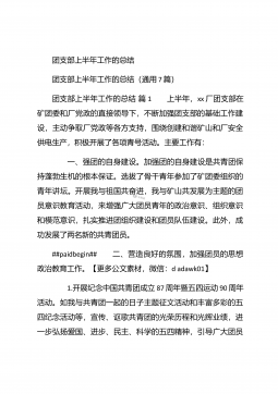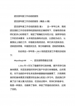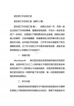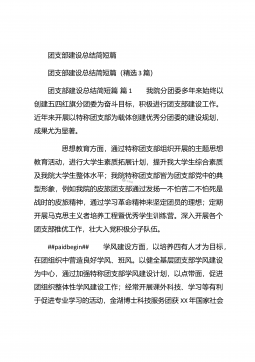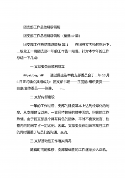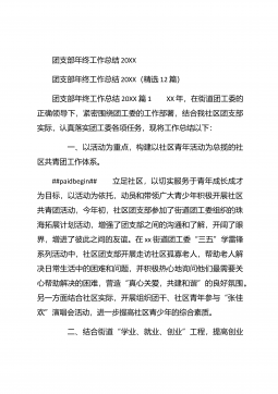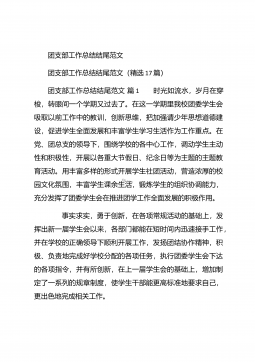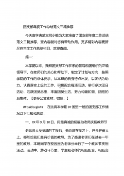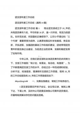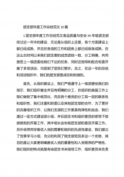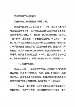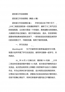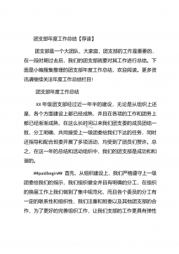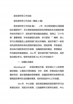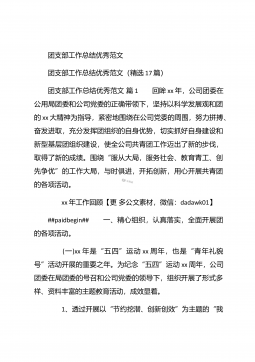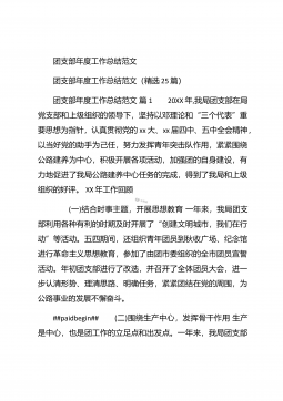 团支部年度工作总结范文团支部年度工作总结范文(精选25篇)团支部年度工作总结范文篇1 20XX年,我局团支部在局党支部和上级组织的领导下,坚持以邓理论和“三个代表”重要思想为指针,认真贯彻党的xx大、xx届四中、五中全会精神,以当好党的助手为己任,努力发挥青年突击队作用,紧紧围绕公路建养为中心,积极开展各项活动,加强团的自身建设,有力地促进了我局公路建养中心任务的完成,得到了我局和上级组织的好评。XX年工作回顾 (一)结合时事主题,开展思想教育一年来,我局团支部利用各种有利的时期及时开展了“创建文明城市,我们在行动”等活动。五四期间,还组织青年团员到秋收广场、纪念馆进行革命主义思想教育,参...