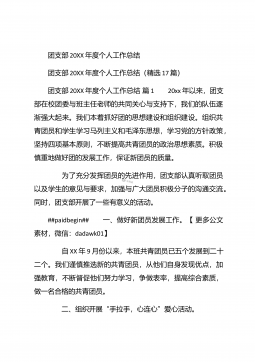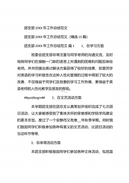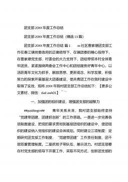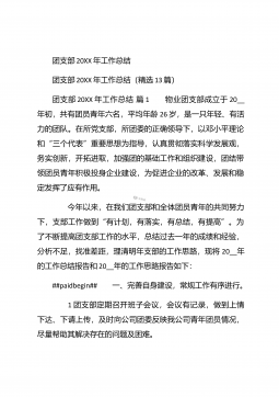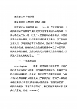 团支部20XX年度总结团支部20XX年度总结(精选14篇)团支部20XX年度总结篇1 20xx年,在公司党支部、上级团组织的正确领导下,我公司团支部紧紧围绕企业的改革、发展与稳定的工作大局,以及广大团员青年的根本需求,以团的先进性教育为基础,以促进青年成长成才为主线,以工作创新为出发点,以竭诚服务青年为落脚点,团的工作在继承中创新,于探索中前进,青春的热血在前进的征途中树立了一面风帆,在风帆中勇往直前,为推动我公司文明建设及企业跨越式大发展注入了生机勃勃的活力。 一、一年来的回顾:##paidbegin## 一年来,我们依靠公司党支部、公司行政的大力支持及广大团干、团员青年的共同努力,共...