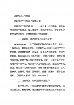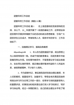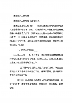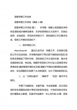 团委学期工作总结团委学期工作总结(精选11篇)团委学期工作总结篇1 本学期,根据上级团委及学校党支部的指示精神及要求,在学校领导的大力支持下,在各位老师、全体团员、学生的共同努力下,我校团的工作已基本完成,现将工作情况总结如下: 一、抓好常规工作。##paidbegin## 通过以会代训,布置工作,交流探讨团的工作方法及经验,本学期共组织了两次团干部的培训活动,同时各支部制定了有针对性、目的性的工作计划和方案,每次活动做到有记录、有总结。根据开学初的工作计划,以及联系学生思想实际,确定每周升旗仪式主题,增强了升旗仪式教育的实效性、此外,在五四期间又发展了86名新团员,壮大了我校团员队伍。...
