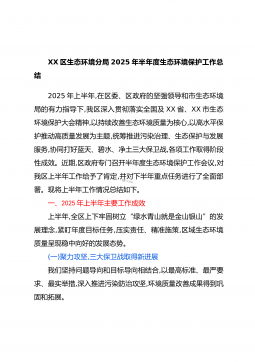 XX区生态环境分局2025年半年度生态环境保护工作总结2025年上半年,在区委、区政府的坚强领导和市生态环境局的有力指导下,我区深入贯彻落实全国及XX省、XX市生态环境保护大会精神,以持续改善生态环境质量为核心,以高水平保护推动高质量发展为主题,统筹推进污染治理、生态保护与发展服务,协同打好蓝天、碧水、净土三大保卫战,各项工作取得阶段性成效。近期,区政府专门召开半年度生态环境保护工作会议,对我区上半年工作给予了肯定,并对下半年重点任务进行了全面部署。现将上半年工作情况总结如下。一、2025年上半年主要工作成效上半年,全区上下牢固树立“绿水青山就是金山银山”的发展理念,紧盯年度目标任务,压实责任...