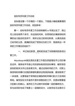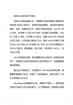 投标办公室年度工作总结投标办公室自组建以来,在董事长及各经理的正确领导及有关部门的关心支持下,坚持科学的发展观,切实抓好招投标制度、业务、监管各项工作,取得了较好的成效。20XX年1至12月份,标书费47万多,20XX年进一步加强了投标管理,20XX年1月至12月份,标书费28万多元。我是20XXXX年5月份进公司工作的,六月份调入制标办工作。我对20XXXX年都不了解,不过从20XX年和20XX年来看20XX年比20XX年标书费高出了大约18万多元。事因难能,所以可贵,中标率在75%以上,实乃来之不易。20XX年的投标成绩,是在董事长及公司技术人员的亲自领导下,在制标办与技术部全体员工的共同...