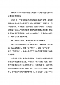 乡镇党委领导班子2025年度落实全面从严治党主体责任和党风廉政建设责任制情况的述责述廉报告2025年,在县委、县政府的坚强领导和县纪委监委的有力指导下,XX镇党委领导班子坚持以习近平新时代中国特色社会主义思想为指导,全面贯彻落实党的二十大和二十届历次全会精神,深入学习贯彻习近平总书记关于党的自我革命的重要思想,深刻领悟“两个确立”的决定性意义,增强“四个意识”、坚定“四个自信”、做到“两个维护”,始终把落实全面从严治党主体责任和党风廉政建设责任制作为最根本的政治担当,以永远在路上的坚韧和执着,一体推进不敢腐、不能腐、不想腐,持续净化优化基层政治生态,为全镇经济社会高质量发展提供了坚强有力的政治...