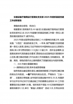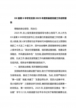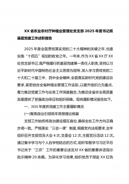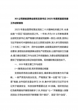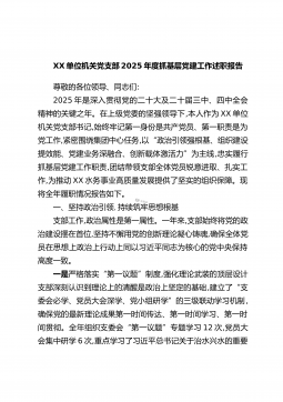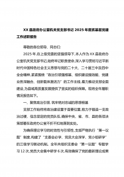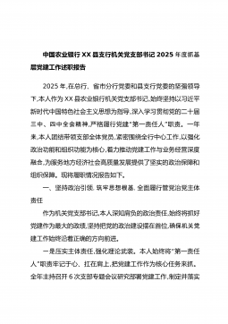 中国农业银行XX县支行机关党支部书记2025年度抓基层党建工作述职报告2025年,在总行、省市分行党委和县支行党委的坚强领导下,本人作为XX县农业银行机关党支部书记,始终坚持以习近平新时代中国特色社会主义思想为指导,深入学习贯彻党的二十届三中、四中全会精神,“”严格履行党建第一责任人职责。一年来,本人团结带领支部全体党员,紧密围绕全行中心工作,以强化政治功能和组织功能为核心,着力推动党建工作与业务经营深度融合,为服务地方经济社会高质量发展提供了坚实的政治保障和组织保障。现将履职情况报告如下。一、坚持政治引领,筑牢思想根基,全面履行管党治党主体责任作为机关党支部书记,本人深知肩负的政治责任,始终...