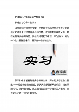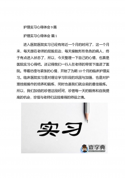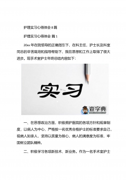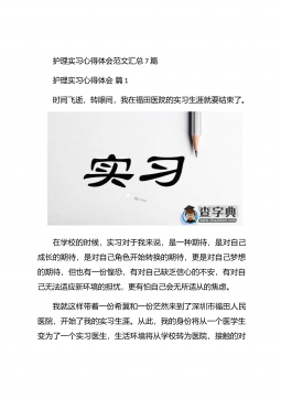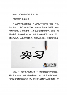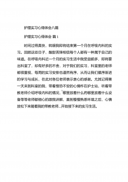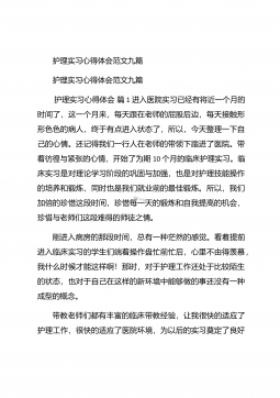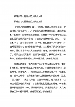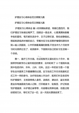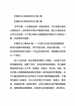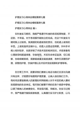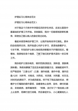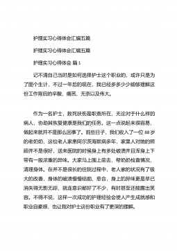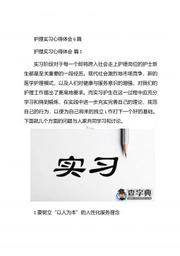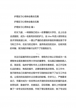 护理实习心得体会6篇护理实习心得体会篇1实习阶段对于每一个即将跨入社会走上护理岗位的护士新生都是至关重要的一段经历。现代社会激烈地市场竞争,新的医学护理模式,以及人们对健康与服务意识的增强,对我们的护理工作提出了更高地要求。而实习护生在这一过程中应充分学习和得到锻炼,在实践中进一步充实完善自己的理论,规范自己的行为,以便为自己将来的独立L作打下一个好的基础。下面就儿个方面的问题与人家共同学习和讨论。1.要树立“以人为本”的人性化服务理念护理的全部工作都是围绕病人入院到出院来展开的。人是一个生物体,时时刻刻有着他(她)各种生理需求和社会需求,病人则在此基础上还有疾病治疗护理的需求。护理工作除执行...