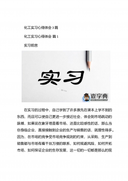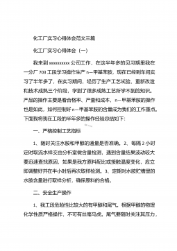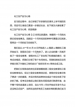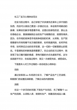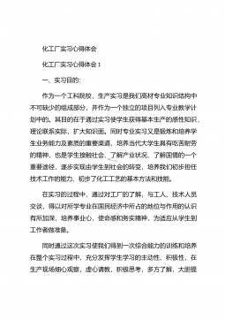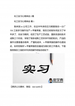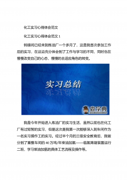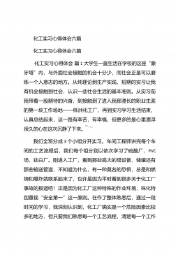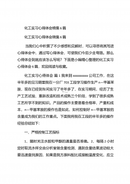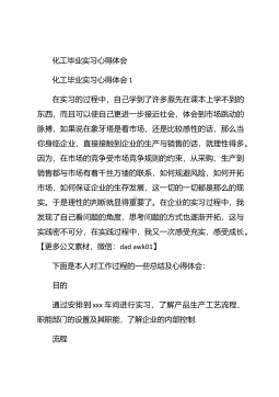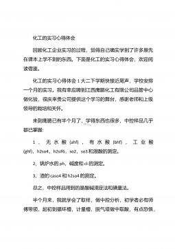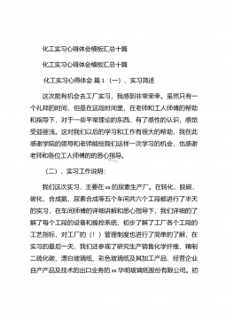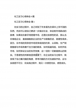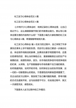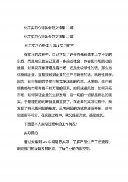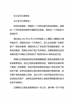 化工毕业实习心得体会化工毕业实习心得体会1在实习的过程中,自己学到了许多原先在课本上学不到的东西,而且可以使自己更进一步接近社会,体会到市场跳动的脉搏,如果说在象牙塔是看市场,还是比较感性的话,那么当你身临企业,直接接触到企业的生产与销售的话,就理性得多。因为,在市场的竞争受市场竞争规则的约束,从采购、生产到销售都与市场有着千丝万缕的联系,如何规避风险,如何开拓市场,如何保证企业的生存发展,这一切的一切都是那么的现实。于是理性的判断就显得重要了。在企业的实习过程中,我发现了自己看问题的角度,思考问题的方式也逐渐开拓,这与实践密不可分,在实践过程中,我又一次感受充实,感受成长。【更多公文素材,微...