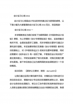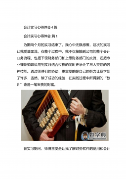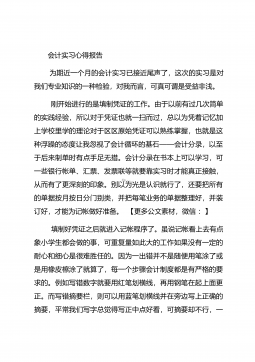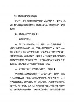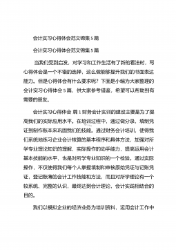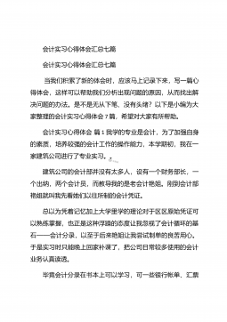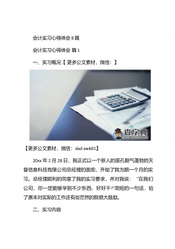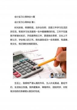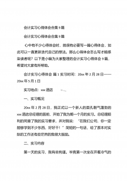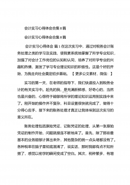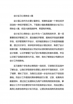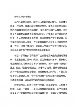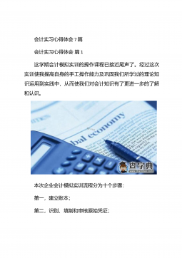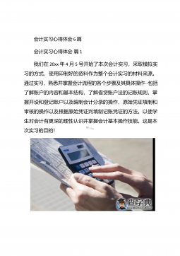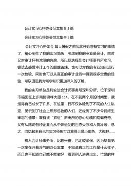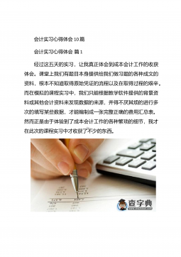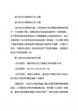会计实习心得体会汇总10篇会计实习心得体会汇总10篇会计实习心得体会篇1三年的会计学习使我对财务知识有了一个全面的了解,但理论知识与实践还是存在一定的差别,为了更好的胜任财务相关工作就需要深入的研究和实习。实习又是对每一位大学毕业生专业知识的一种检验,它让我们学到了很多在课堂上根本就学不到的知识,既开阔了视野,又增长了见识,为我们以后进一步走向社会打下坚实的基础,也是我们走向工作岗位的第一步。第一部分实习地点.时间.任务1.实习地点:西安市凯立化工有限公司未央路96号。2.实习时间:20xx年11月-20xx年1月。3.实习任务:来到公司首先,是王会计带我大体认识会计应干的工作和平时要注意的一...