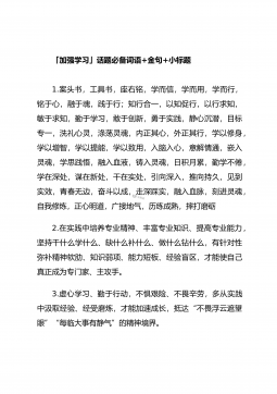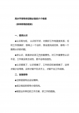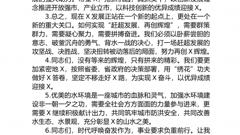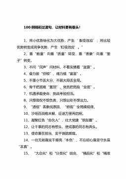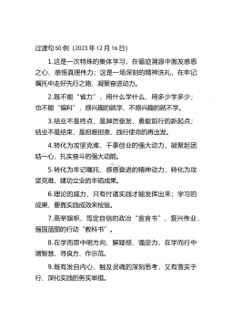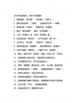 党性修养类过渡句50例1.少一分个人得失的计算,就能多一分知重负重、攻坚克难的奋发有为;少一分名缰利锁的束缚,就能多一分敢于负责、勇于担当的闯劲干劲。2.始终做到“忠、专、实”,对党忠诚,专业专注,求真务实;始终做到“勤、正、廉”,勤勉尽责,弘扬正气,廉洁奉公。3.把激发出来的学习工作热情转化为干事创业的强大动力,把汲取到的智慧力量转化为攻坚克难的过硬本领。4.在学思用贯通上,拿出看得见“管用”的实招;在知行合一上,凸显看得见“力行”的实效。5.把个人看得更轻一些,把组织看得更重一些;把待遇看得更轻一些,把工作看得更重一些。6.有掏心见胆的真诚,也有从谏如流的胸怀;有光明磊落的坦荡,也有言行一...