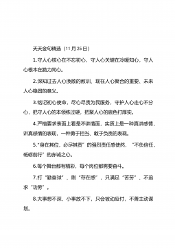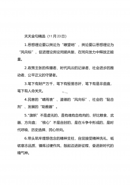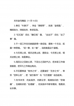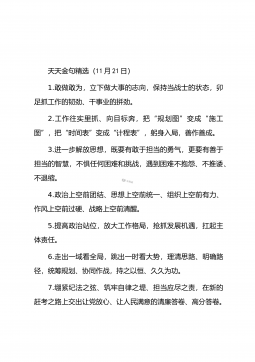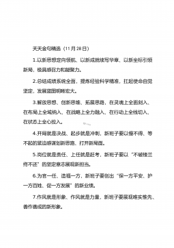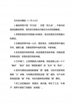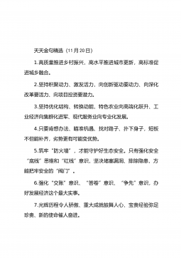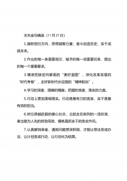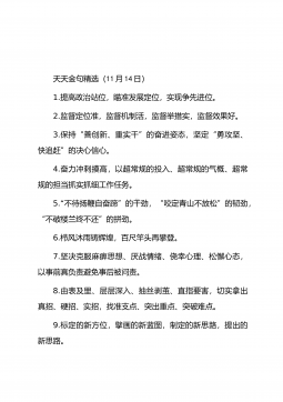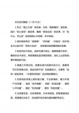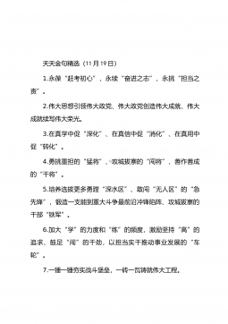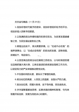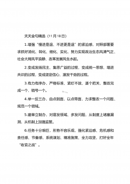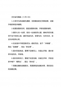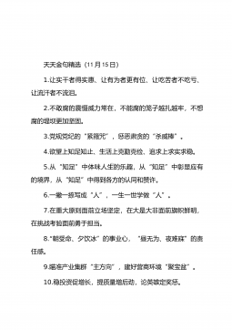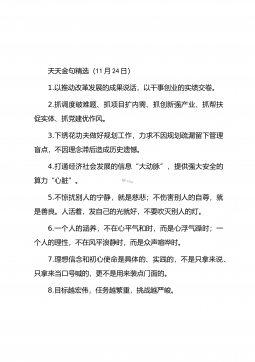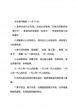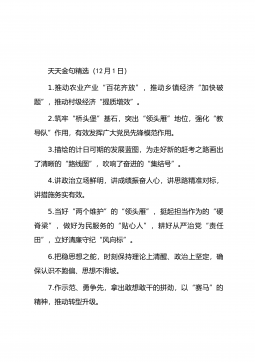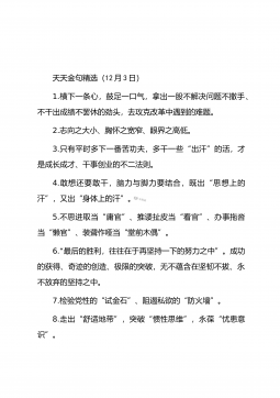 天天金句精选(12月3日)1.横下一条心,鼓足一口气,拿出一股不解决问题不撒手、不干出成绩不罢休的劲头,去攻克改革中遇到的难题。2.志向之大小、胸怀之宽窄、眼界之高低。3.只有平时多下一番苦功夫,多干一些“出汗”的活,才是成长成才、干事创业的不二法则。4.敢想还要敢干,脑力与脚力要结合,既出“思想上的汗”,又出“身体上的汗”。5.不思进取当“庸官”、推诿扯皮当“看官”、办事拖沓当“懒官”、装聋作哑当“堂前木偶”。6.“最后的胜利,往往在于再坚持一下的努力之中”。成功的获得、奇迹的创造、极限的突破,无不蕴含在坚韧不拔、永不放弃的坚持之中。7.检验党性的“试金石”、阻遏私欲的“防火墙”。8.走出“...