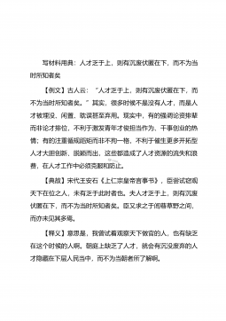 写材料用典:人才乏于上,则有沉废伏匿在下,而不为当时所知者矣【例文】古人云:“人才乏于上,则有沉废伏匿在下,而不为当时所知者矣。”其实,很多时候不是没有人才,而是人才被埋没、闲置、耽误甚至弃用。现实中,有的强调论资排辈而非论才排位,不利于激发青年才俊担当作为、干事创业的热情;有的注重循规蹈矩而非不拘一格,不利于催生更多开拓型人才大胆创新、脱颖而出,这些都造成了人才资源的流失和浪费,在人才工作中必须克服和防止。【典故】宋代王安石《上仁宗皇帝言事书》,臣尝试窃观天下在位之人,未有乏于此时者也。夫人才乏于上,则有沉废伏匿在下,而不为当时所知者矣。臣又求之于闾巷草野之间,而亦未见其多焉。【释义】意思是...