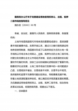 国务院办公厅关于完善建设用地使用权转让、出租、抵押二级市场的指导意见国办发〔20XX〕XX号各省、自治区、直辖市人民政府,国务院各部委、各直属机构:土地市场是我国现代市场体系的重要组成部分,是资源要素市场的重要内容。改革开放以来,通过大力推行国有建设用地有偿使用制度,我国基本形成了以政府供应为主的土地一级市场和以市场主体之间转让、出租、抵押为主的土地二级市场,对建立和完善社会主义市场经济体制、促进土地资源的优化配置和节约集约利用、加快工业化和城镇化进程起到了重要作用。随着经济社会发展,土地二级市场运行发展中的一些问题逐步凸显,交易规则不健全、交易信息不对称、交易平台不规范、政府服务和监管不完善...