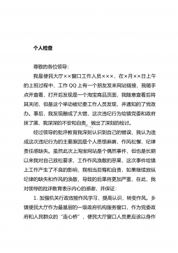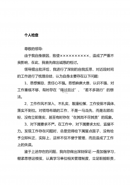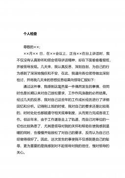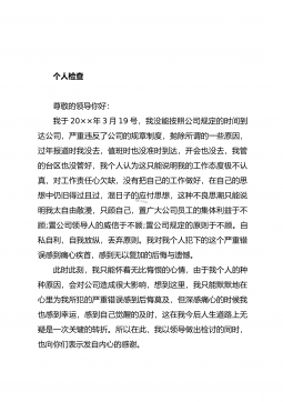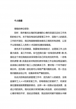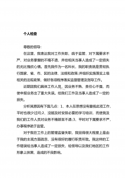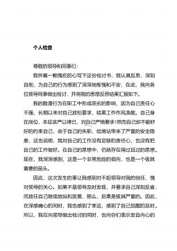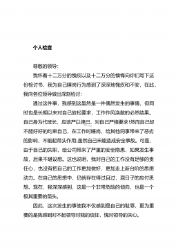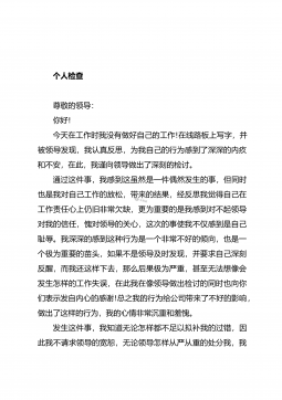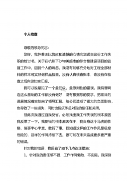 个人检查尊敬的领导:你好!今天在工作时我没有做好自己的工作!在线路板上写字,并被领导发现,我认真反思,为我自己的行为感到了深深的内疚和不安,在此,我谨向领导做出了深刻的检讨。通过这件事,我感到这虽然是一件偶然发生的事,但同时也是我对自己工作的放松,带来的结果,经反思我觉得自己在工作责任心上仍旧非常欠缺,更为重要的是我感到对不起领导对我的信任,愧对领导的关心,这次的事使我不仅感到是自己耻辱。我深深的感到这种行为是一个非常不好的倾向,也是一个极为重要的苗头,如果不是领导及时发现,并要求自己深刻反醒,而我还这样下去,那么后果极为严重,甚至无法想像会发生怎样的工作失误,在此我在像领导做出检讨的同时也向...