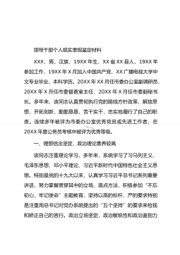 领导干部个人现实表现鉴定材料XXX,男,汉族,19XX年生,XX省XX县人,19XX年参加工作,19XX年X月加入中国共产党,XX广播电视大学中文专业毕业,本科学历。20XX年XX月任市委办公室副调研员,20XX年X月任市委督查室主任,20XX年X月任市委副秘书长。多年来,该同志认真贯彻执行党的路线方针政策,解放思想,开拓创新,勤勤恳恳,苦干实干,忠实地履行了自己的职责。连续多年被评为市委办公室优秀党员或先进工作者,在20XX年度公务员考核中被评为优秀等级。一、理想信念坚定,政治理论素养较高该同志注重理论学习,多年来,系统学习了习马列主义、毛泽东思想、邓小平理论、习近平新时代中国特色社会主义思...