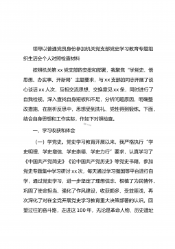 领导以普通党员身份参加机关党支部党史学习教育专题组织生活会个人对照检查材料按照机关第xx党支部的安排和部署,我聚焦“学党史、悟思想、办实事、开新局”主题要求,与xx支部的同志开展了谈心谈话xx人次,互相交流思想、交换意见xx条,同时进行了自我检视,深入查找自身短板和不足,分析问题原因,明确整改措施,在剖析反思中,思想受到洗礼、党性得到锻炼。下面,结合自身思想和工作实际,作如下对照检查。一、学习收获和体会(一)学党史。党史学习教育开展以来,我严格执行“学史明理、学史增信、学史崇德、学史力行”要求,认真学习了《中国共产党简史》《论中国共产党历史》等党史书籍,参加党史专题集中学习研讨xx次,每天通过...